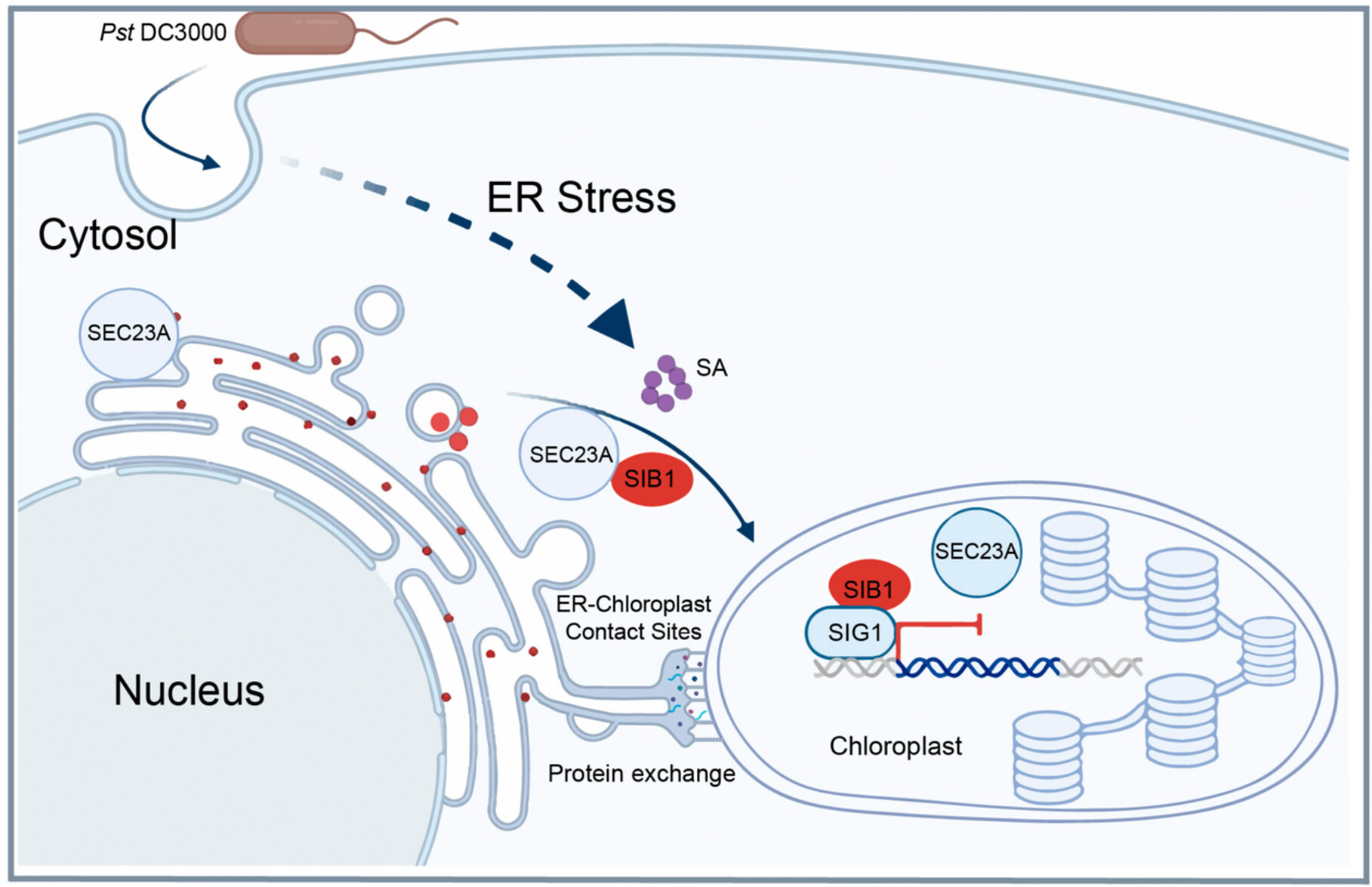 SEC23A mediates membrane trafficking between the endoplasmic reticulum (ER) and Golgi apparatus and interacts with the immunity protein SIGMA FACTOR-BINDING PROTEIN1 in Arabidopsis. Under stress, both proteins relocate from the ER to chloroplasts, suppressing photosynthesis genes and enhancing defense genes.