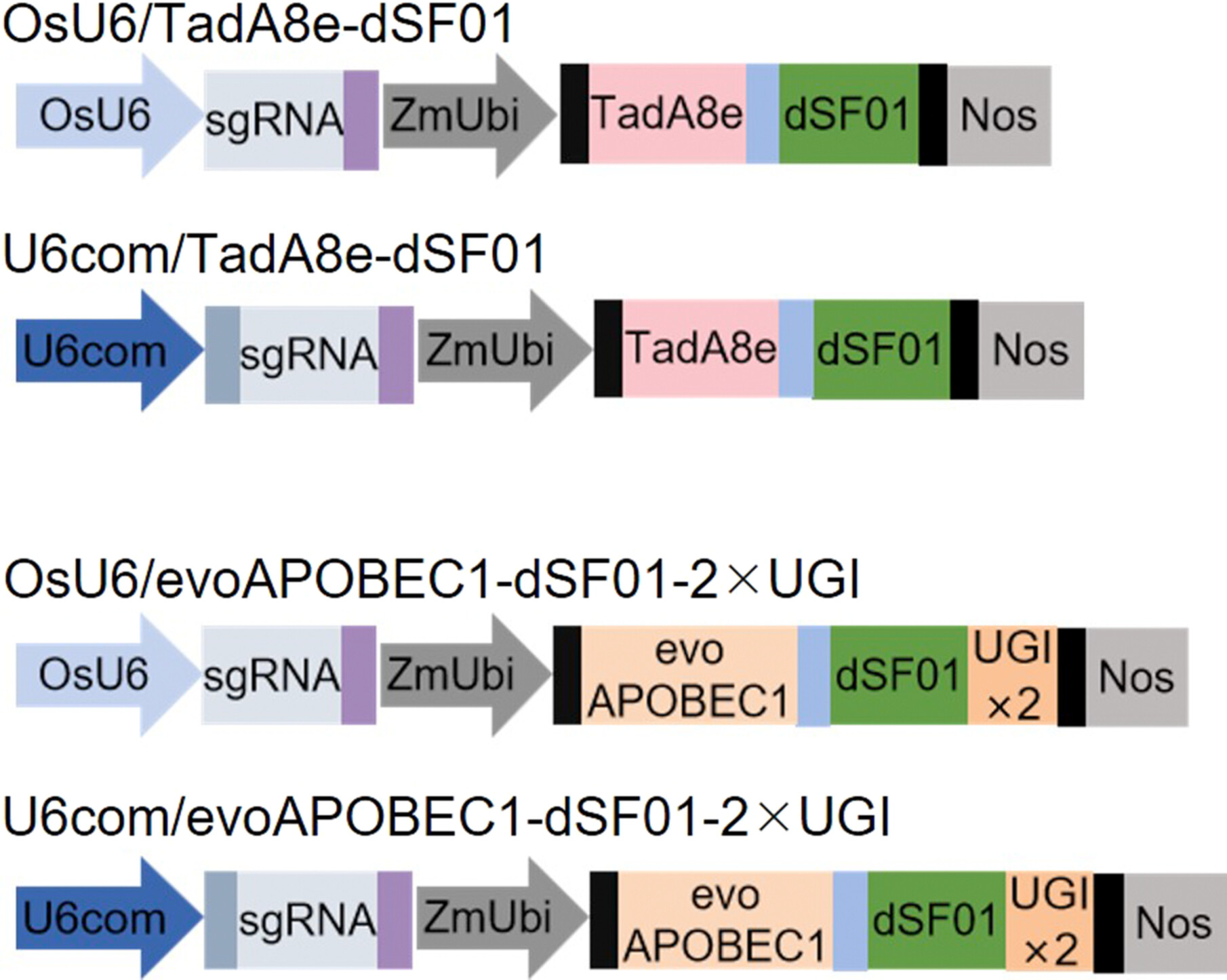 Adenine and cytosine base editing using dCas-SF01 and the 35S-CmYLCV-U6 composite promoter successfully introduced targeted base substitutions at multiple loci in rice, with average editing efficiency of 33.3%. Using the protospacer adjacent motif (PAM)-relaxed SF01-IKRR variant enabled base editing using 5'-NTN PAMs in rice.