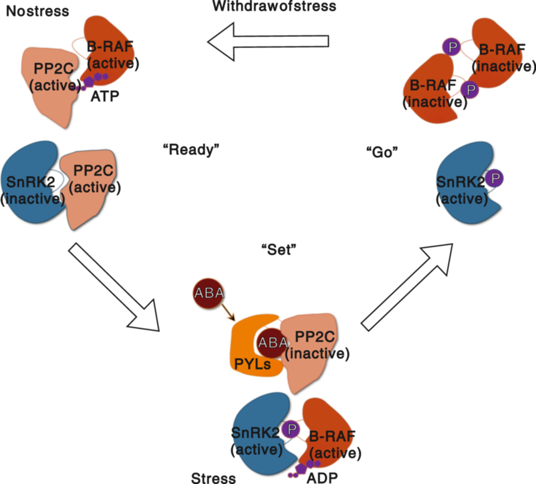 Maintaining basal B-RAF kinase activity for abscisic acid signaling via reciprocal phosphoregulation of a single serine residue